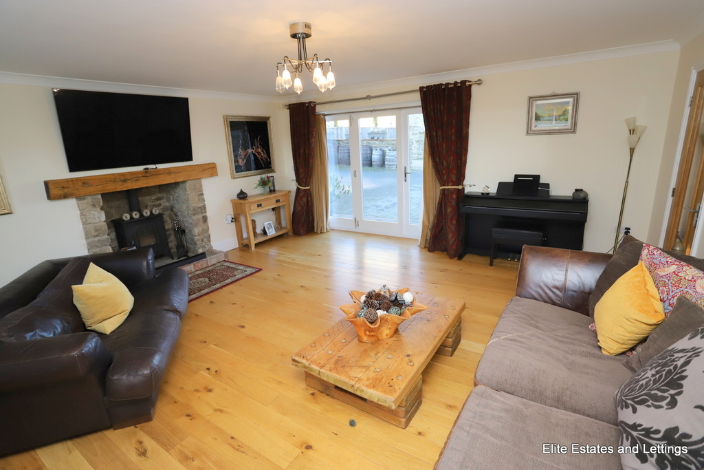 The property occupies an extensive plot and benefits from a paddock extending to approximately one acre. Internally, the accommodation begins with a bright and welcoming porch leading into a spacious open-plan kitchen and dining area. The kitchen is beautifully appointed with modern wall units, elegant marble worktops and a practical breakfast bar. Stylish bi-fold doors open onto the rear garden, making this an ideal space for both entertaining and everyday living. The kitchen flows seamlessly into a generous lounge, which also features bi-fold doors, allowing natural light to flood the room. A versatile office offers potential for use as a fourth bedroom, while a utility room and ground-floor WC complete the ground-floor layout.